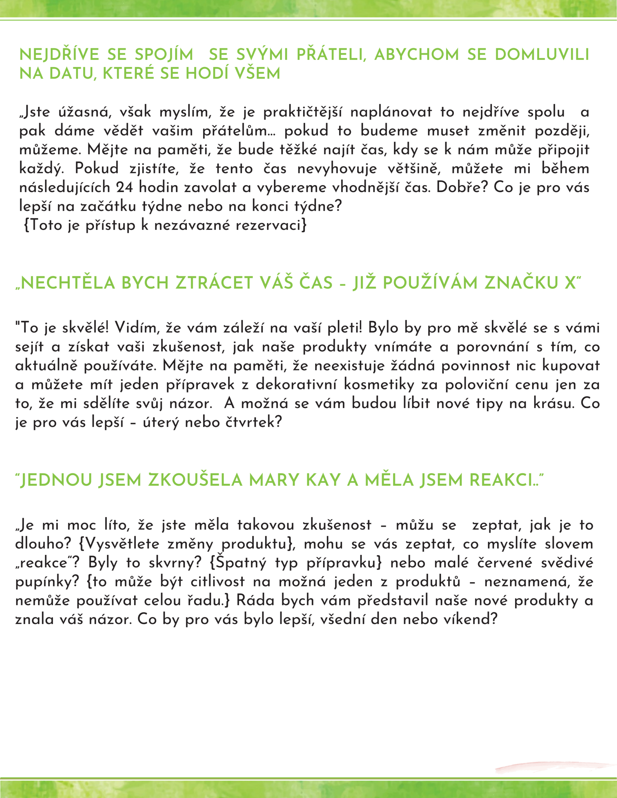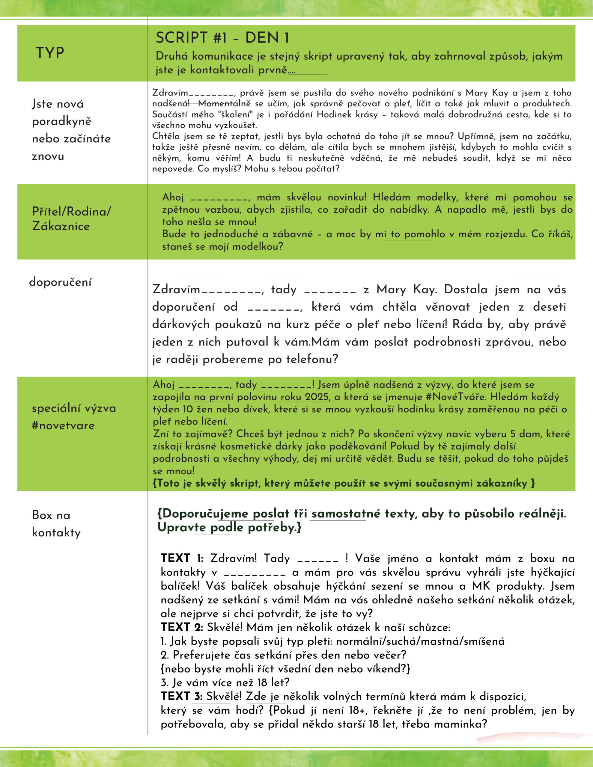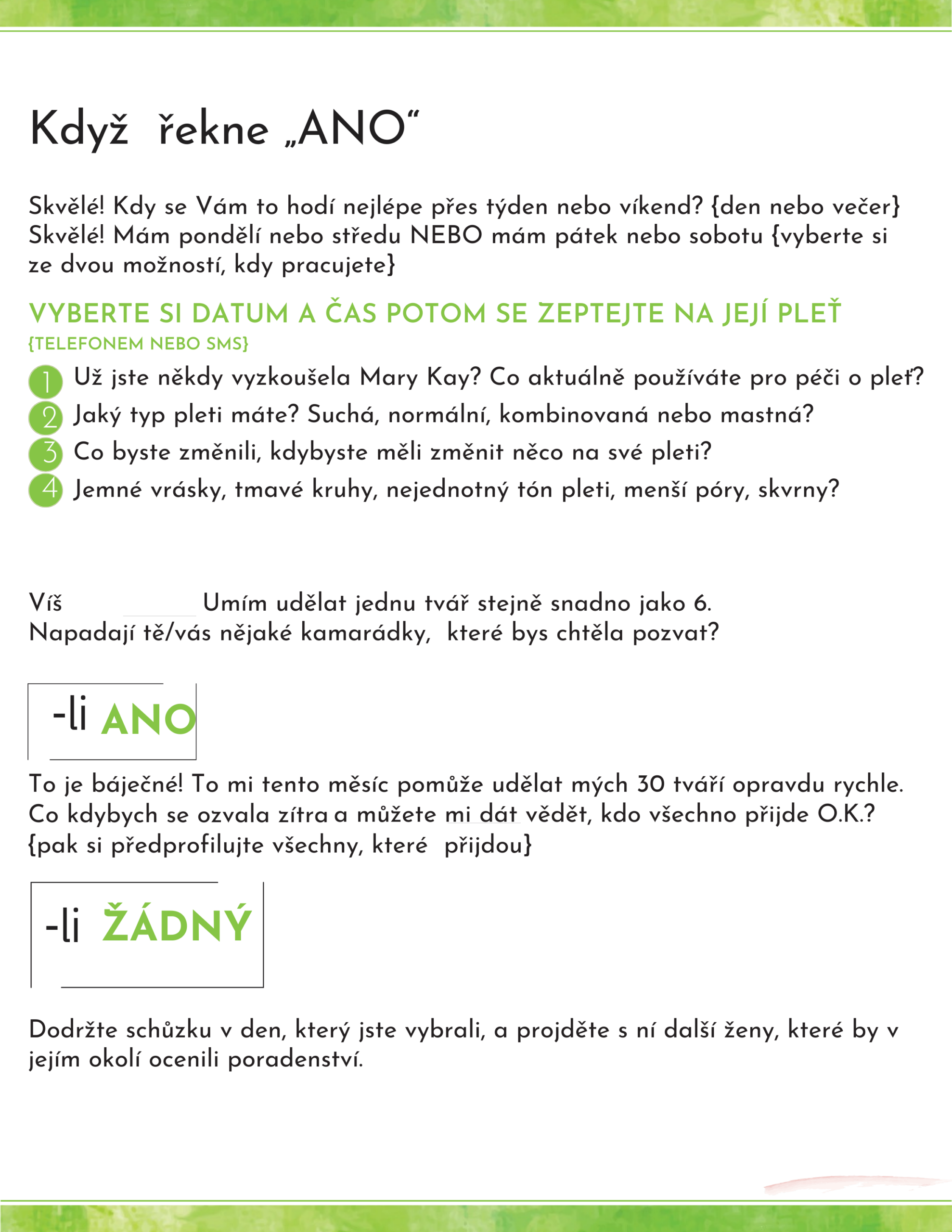 Domlouvání schůzek je srdcem vašeho Mary Kay podnikání. Právě tady vznikají vztahy, důvěra i nové příležitosti – a právě tady se rozhoduje o vašich výsledcích. Proto vznikl tento praktický plán, který vás krok za krokem provede tím, jak si systematicky a s lehkostí naplňovat diář schůzkami.