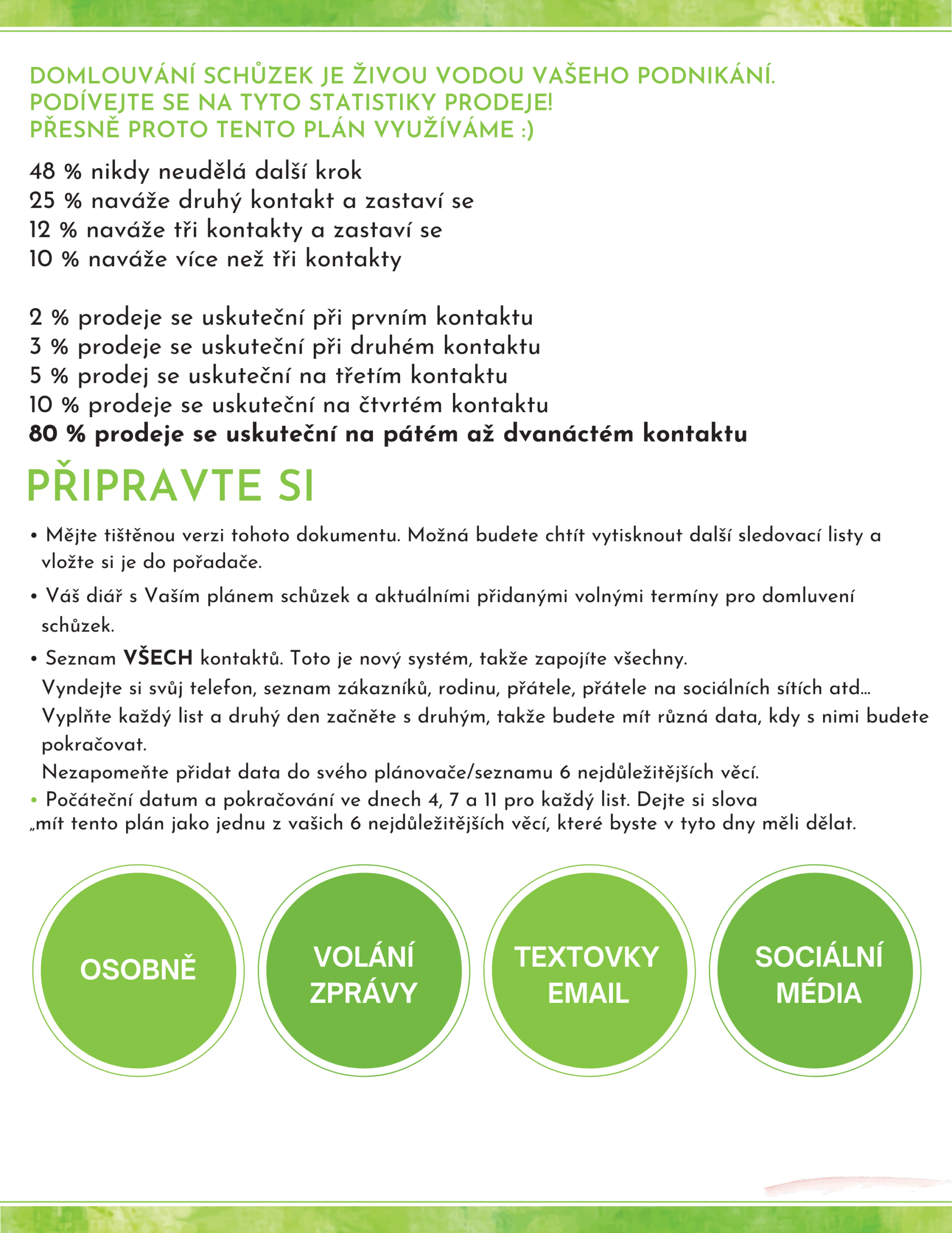 Najdete v něm jasný a ověřený postup, konkrétní skripty i přehledný systém následných kontaktů, díky kterému už žádná příležitost „nezapadne“. Stačí ho začít používat – a postupně si vytvoříte návyk, který posune vaše podnikání na novou úroveň.